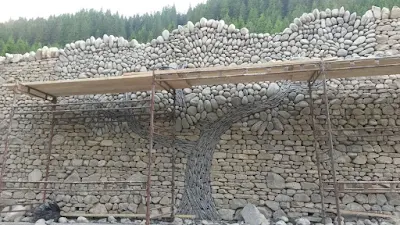 When I look at the stone tree installation that Richard Clegg and his son Lewyn created in the Tatra mountains between Slovakia and Poland I see a beautiful interpretation of the dry stone tree of Eric Landman’s. There is no appropriation here as Richard gives full credit to Eric for the original idea. What Richard does is develop the theme as any composer or painter or any artist might do. Using spoil tailings from the local mines for the walling stone, and rounded granite boulders from a local mountain stream, and local basalt to create the tree bark, the piece, built up against a 5 meter high battered concrete 100s of feet long retaining wall, incorporating Richard's excellent dry stone technique becomes another kind of stone masterpiece. (Wall ties and mortar were only used too to tie the thick mosaic of stone cladding to the concrete wall behind)