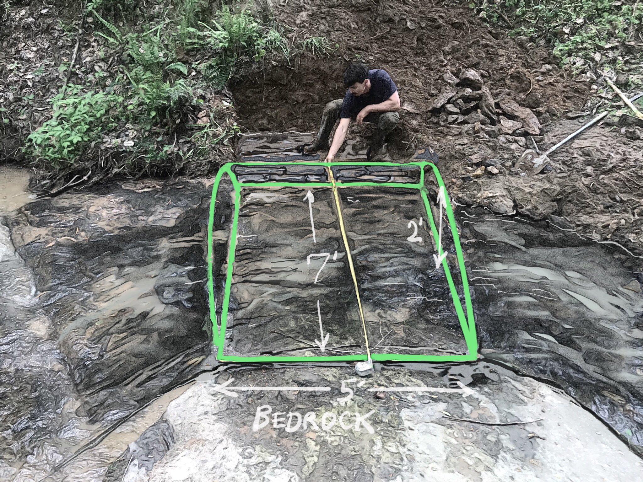 The dimensions for the centring, which will support our next dry stone bridge, have been carefully worked out, and the lines where it will be going, are shown here in green. It will be built by seven students in the next five days.