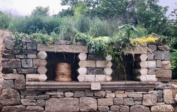 We completed our bee bowle structure yesterday. The bees in the ‘skep’ you see in the niche on the right , loved it. The bees on the right have not arrived yet.